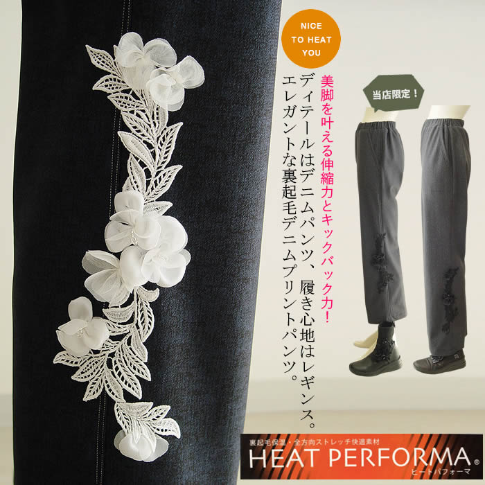 【ベルパーチ】お花&レース裏起毛デニムプリントパンツ