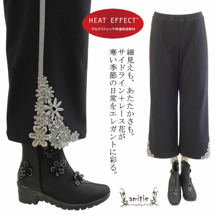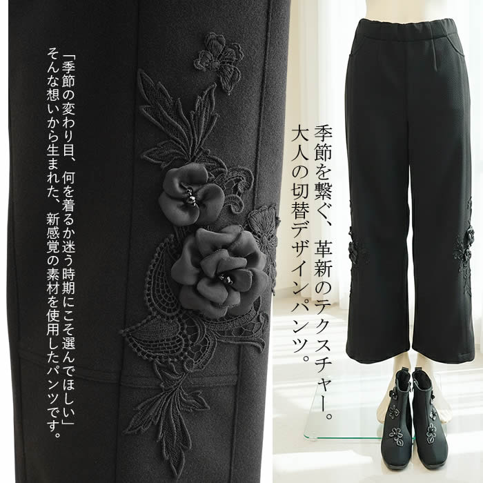【アミティエ】レース花エフェクトセミワイドパンツ