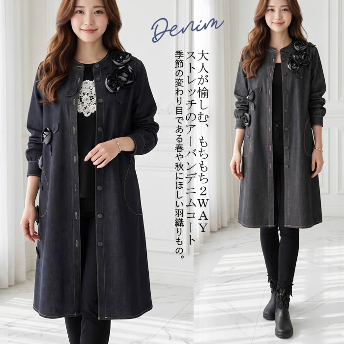 【ベルパーチ】デニム花ストレッチメモリータフタコート¥50,600(税込み)紺・黒 上記商品について問い合わせ