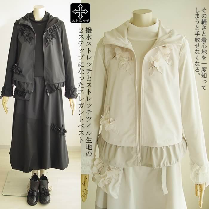 【ベルパーチ】お花裏フリースナイロンロングベスト¥37,400(税込み)黒・ベージュ・カーキ 上記商品について問い合わせ |